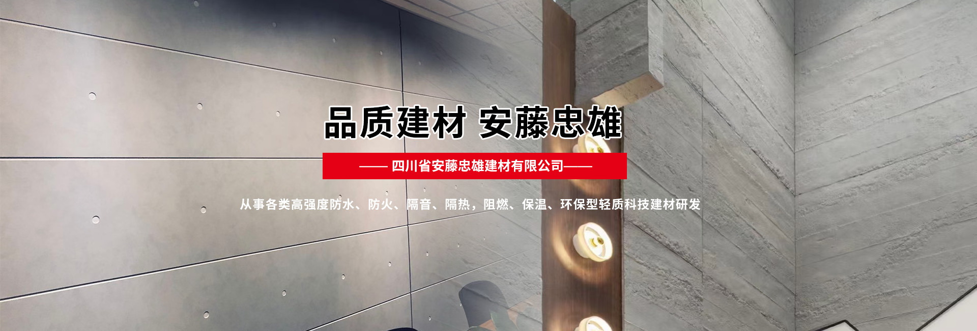 四川省安藤忠雄建材有限公司是一家經營各種進口裝飾材料的公司,主營產品有:維水泥壓力板、硅酸鈣板、天花板、防爆板、泄壓板、穿孔吸音板、木紋板、棧道板、外墻木紋掛板、LOFT鋼結構樓板、隔熱板凳、清水裝飾板、輕質墻板等諸多產品。產品主要應用于適用于家裝、辦公樓、展館、酒店、會所、體育館、服裝、餐飲、學校等場所。